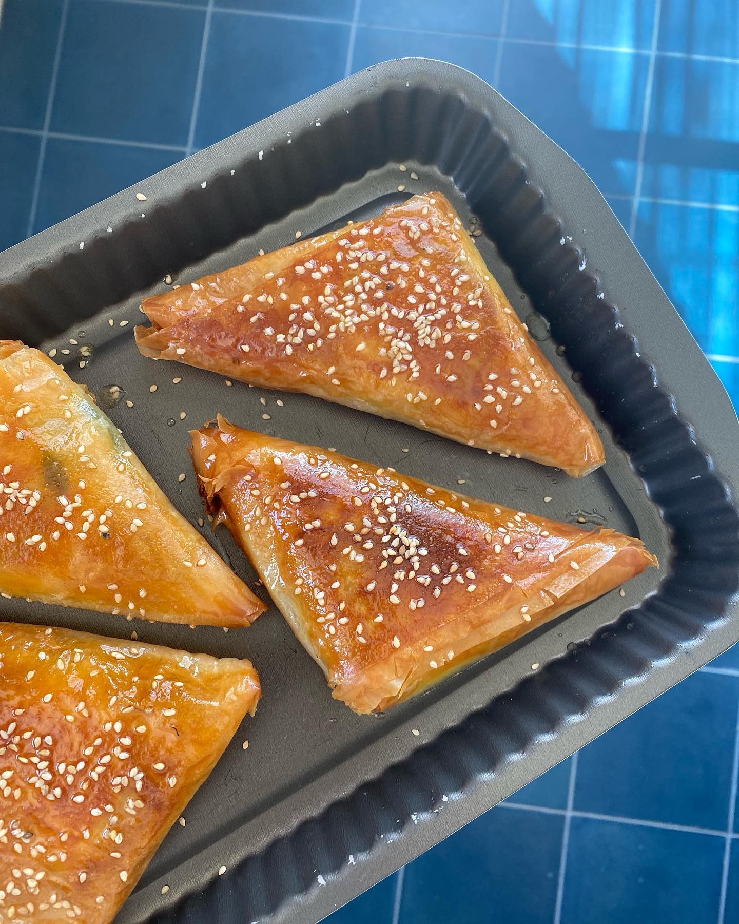 Lustrez les samoussas à la sortie du four avec votre mélange beurre et miel, saupoudrez de sésame, dressez sur la salade et dégustez sans attendre